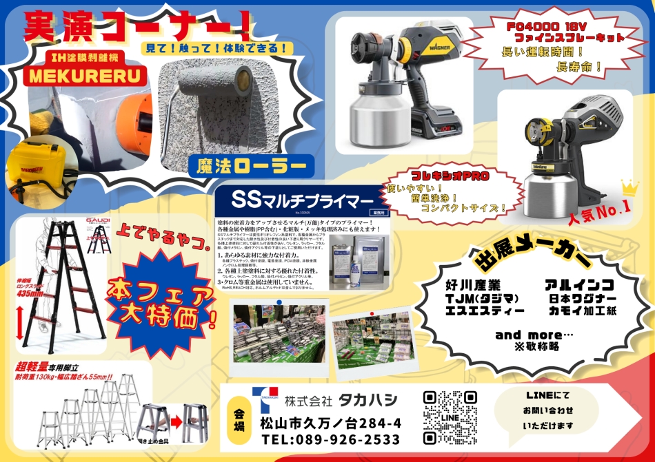 2週間後の7/19(金)! 9年ぶりに、タカハシフェアが開催! 塗装・防水現場で大活躍するアイテムを、実際に触って体感できます! またとない機会ですので、せひ、ご来場くださいませ !o(^-^o)(o^-^)o!