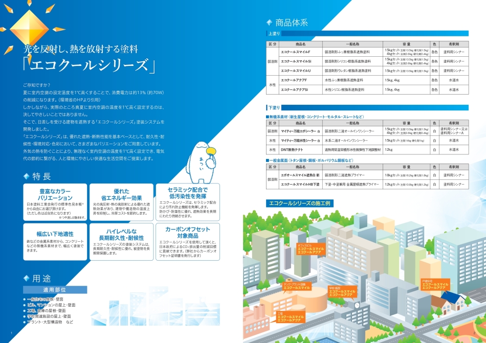 建物の熱を抑制する遮熱・断熱塗料として、永年トップブランドのエコクールシリーズ。 リニューアルして、爽やかカラー、オシャレカラーもラインナップに追加! 建物の屋根や壁に塗って、今年のこの暑さを和らげましょう ヾ(*'ー')o!