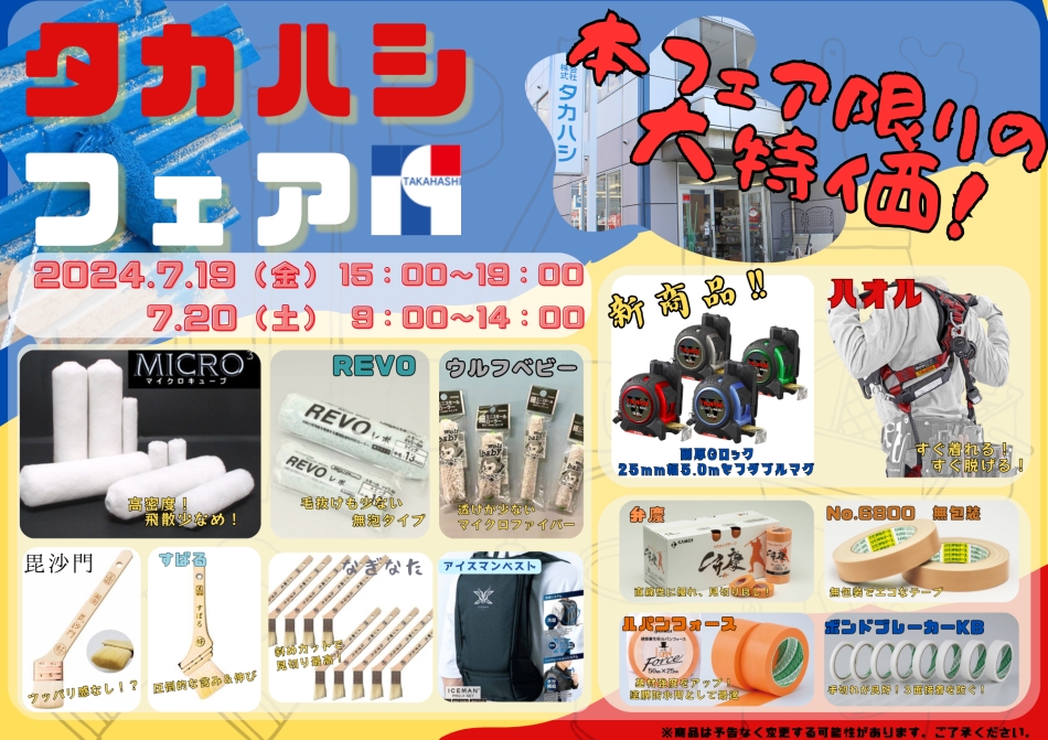 1週間後の7/19(金)! 9年ぶりに、タカハシフェアが開催! 塗装・防水現場で大活躍するアイテムを、実際に触って体感できます! またとない機会ですので、せひ、ご来場くださいませ !o(^-^o)(o^-^)o!