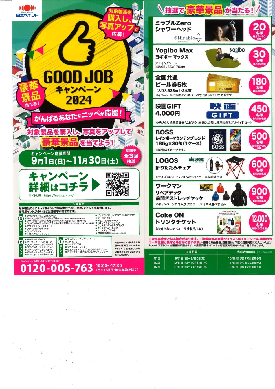 ニッペの塗料購入で豪華景品が当たる、GOOD JOB キャンペーン、開催中! かなりの確率で当選しますから、ぜひこの秋はニッペの塗料採用をご検討下さい (^-^*)/!