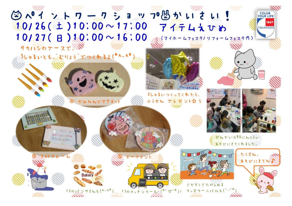 10/26(土)〜10/27(日)にアイテムえひめで開催されるマイホームフェスタ/リフォームフェスタに、タカハシがペイントワークショップを出展します! 前回は開幕から閉幕までの時間ほぼずべてで来場くださり、時には待機列もできるほどにご参加いただきました。 今回も、多数のご来場、お待ちしています (* '-')ノ