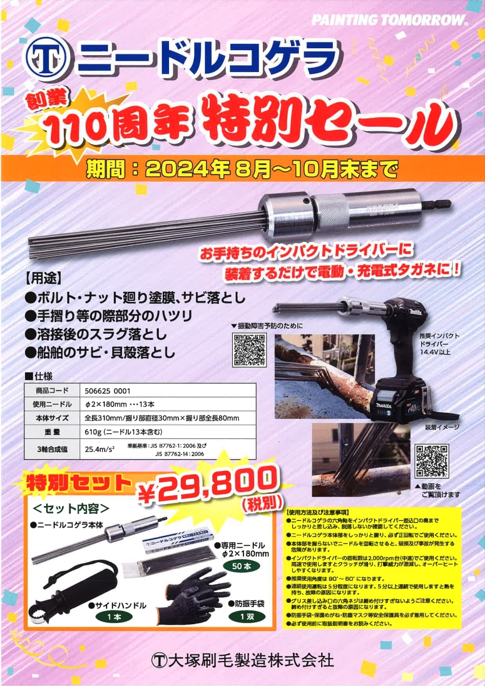 鉄部の塗り替え工事に大役立ちする、既存塗膜・錆び落としツールの、ニードルコケラ…。今月末まで大SALEを開催中! まだお持ちでない方は、今後の現場の生産性向上へ向けて、ぜひ調達検討ください (*'▽')!
