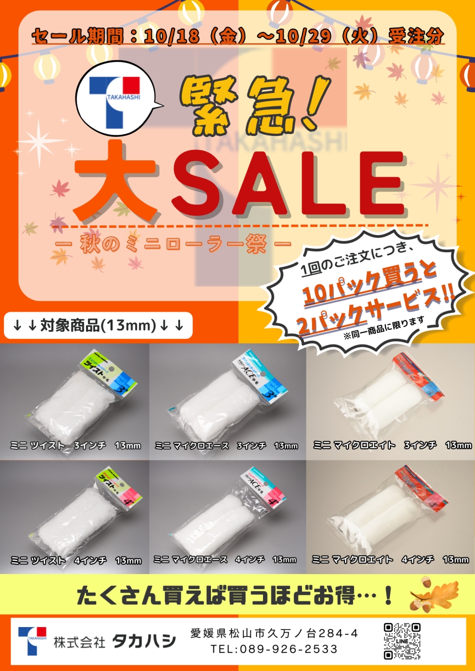 10/29(火)まで! なんと、売れ筋のミニローラーが、10パックご購入で2パックも無償サービスが付いてくる! 期間限定のウルトラSALE、せひ、ご利用下さい ヾ(≧▽≦)ノ!
