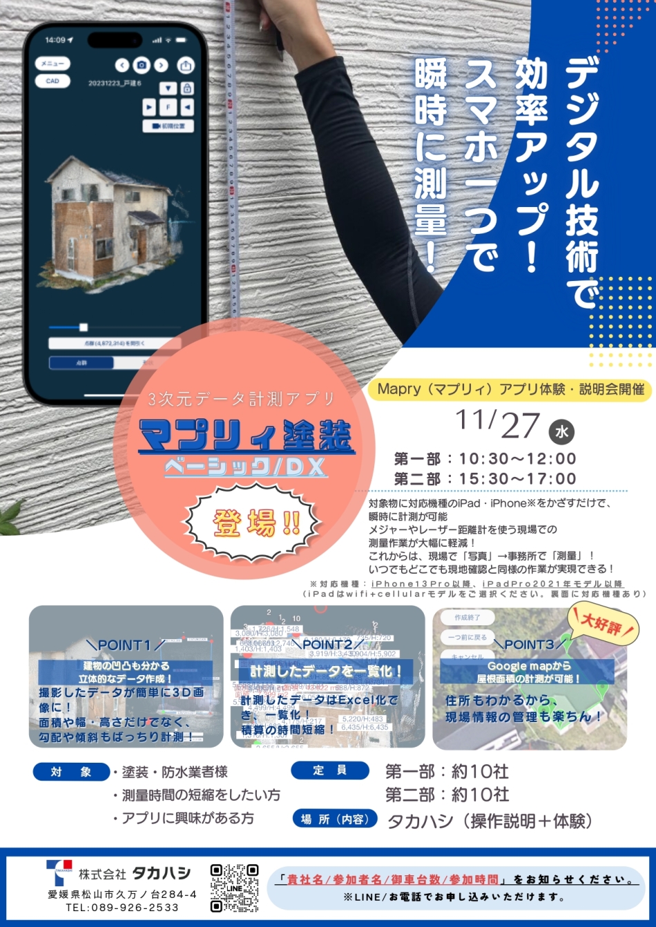 建築測量も、アナログからデジタルの時代へ! スマートフォンでグルっとスキャンすれば、あっという間に数量算出! 従来の類似システムよりもそうとう使いやすい! そのシステムの体験会を行いますので、測量やそこからの数量算出にお悩みの方は、ぜひ、ご来場ください (^▽°)v!