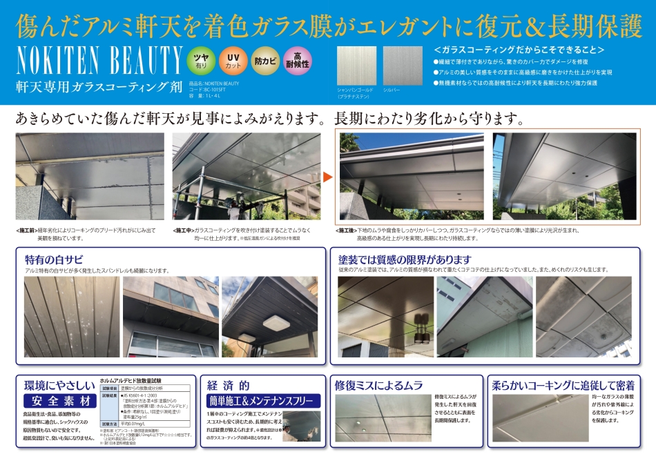 汚れたりくすんでいたいた天井(軒天)が、ピカピカに蘇る! そしてその質感が永く維持される! 大切な建物だからこそ、細部までキレイに維持したい。 天井以外でも、そんな願いを叶えるコーティングシリーズです *^▽^)ノ!