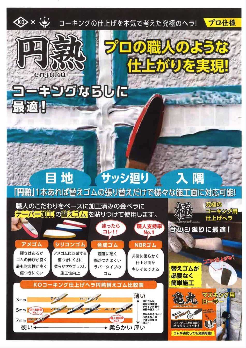 近年、シーリング職人様たちにたくさんご愛用いただいている、円熟シリーズ! タカハシではラインナップ豊富に在庫を揃えていますので、ぜひ店頭で感触をお試しください (≧∀≦*)ノ!