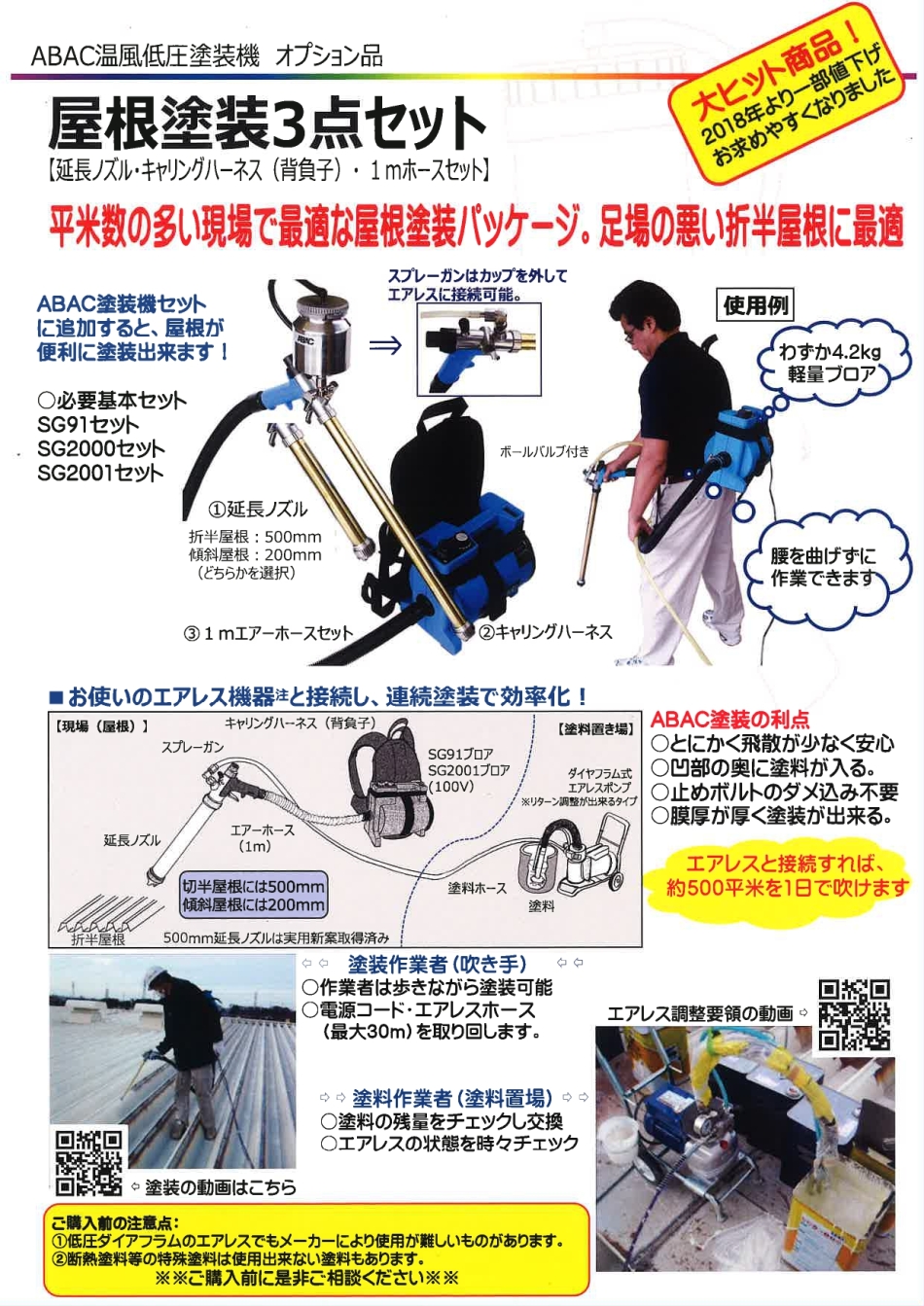 屋根塗装の現場で愛用されているABAC温風低圧塗装機が、安価にパッケージ化! まだお持ちでない塗装業者の方々は、現場の生産性向上を目指し、ぜひ調達検討ください (*゜▽゜*)!
