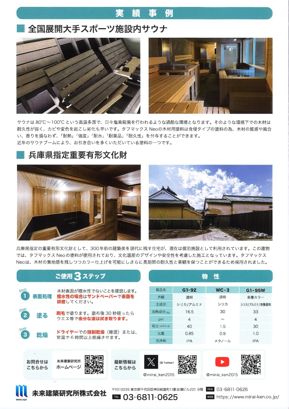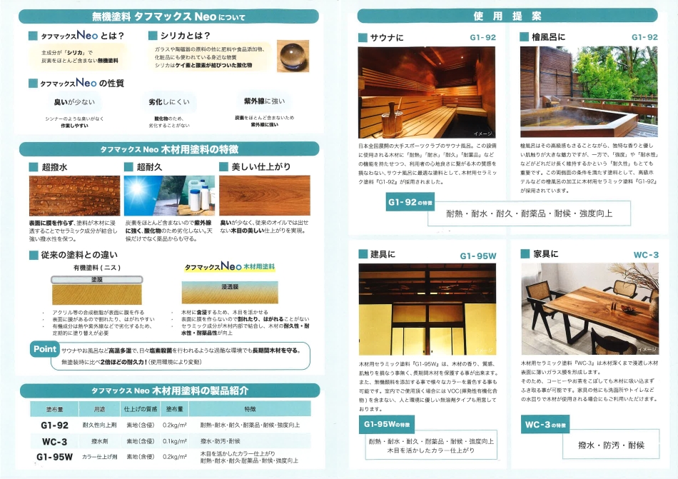 木の美しさを、限界まで引き出そう! 無機系シリカが生む“超撥水・超耐久”性能で、木材を水・熱・薬品・紫外線から徹底ガード! 木の呼吸を妨げず、香りや質感をそのままに、これまでにない美しい仕上がりを実現。サウナ、露天風呂、建具、家具まで――過酷な環境でも本物の木を守り抜く、次世代木材用塗料です v( ̄∇ ̄)v!