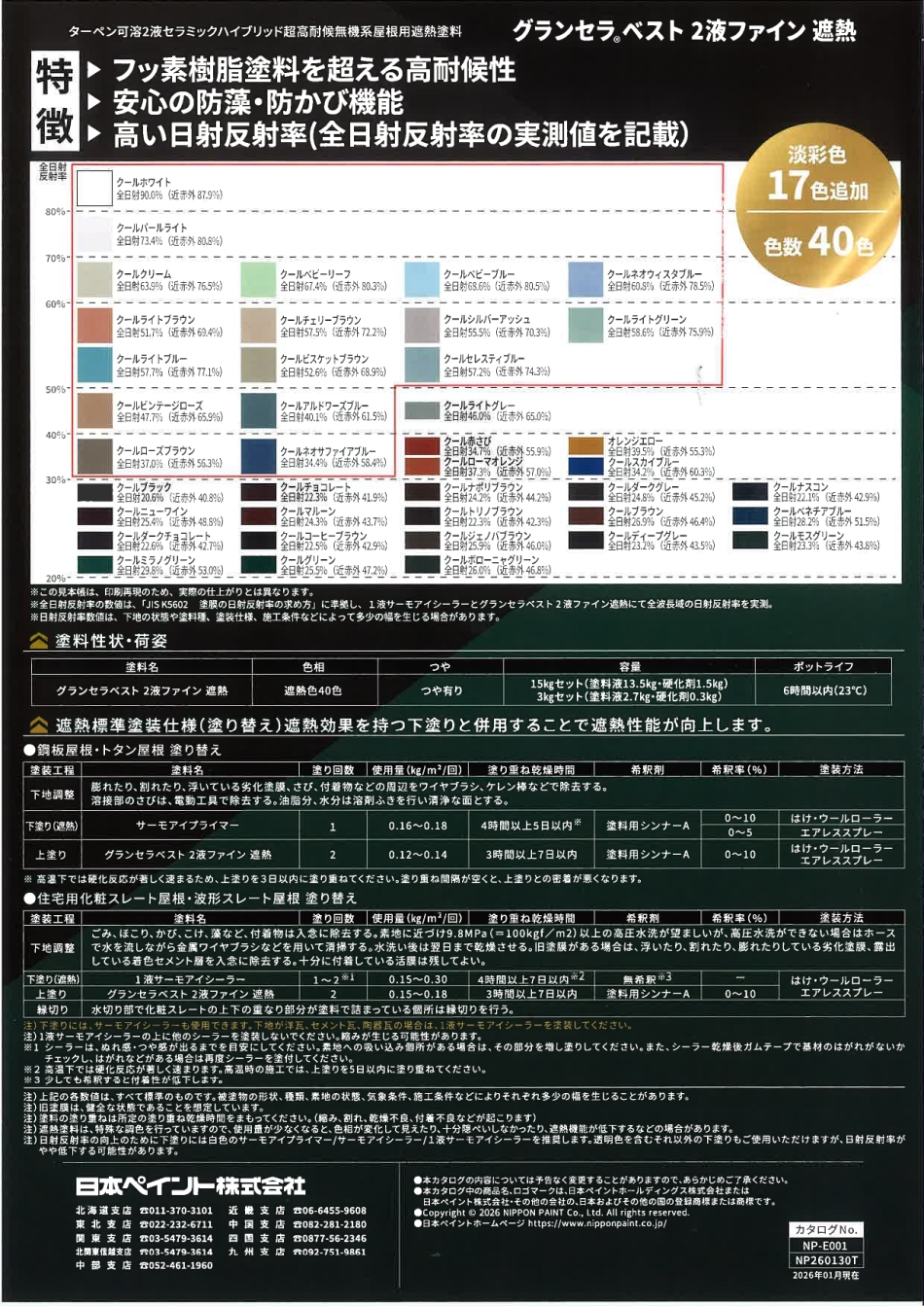 耐用年数が永く、今が採用の”旬”である無機系塗料グランセラシリーズ。 そのグランセラシリーズの屋根用タイプに、遮熱色がたくさん追加! 淡い色が増え、より遮熱効果が期待できます! 地域によっては補助金対応が効きますから、暑くなる夏場に向けて、ぜひこれら遮熱色で屋根を塗り替えましょう… (。ゝ∀・)ゞ!