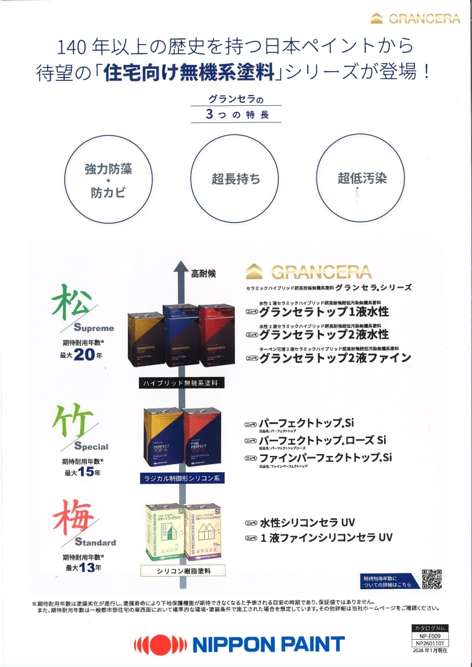 永い耐用力で、大切な色がいつまでも褪せずに続く塗料、グランセラシリーズ。 今、外装の塗り替えでは、もっとも旬な塗料です。 そんなグランセラシリーズの、タカハシでの調色バリエーションが、この度、拡大しました! お急ぎで必要になる時は、ぜひ、お気軽にタカハシにご相談ください… (*^o^*)/!