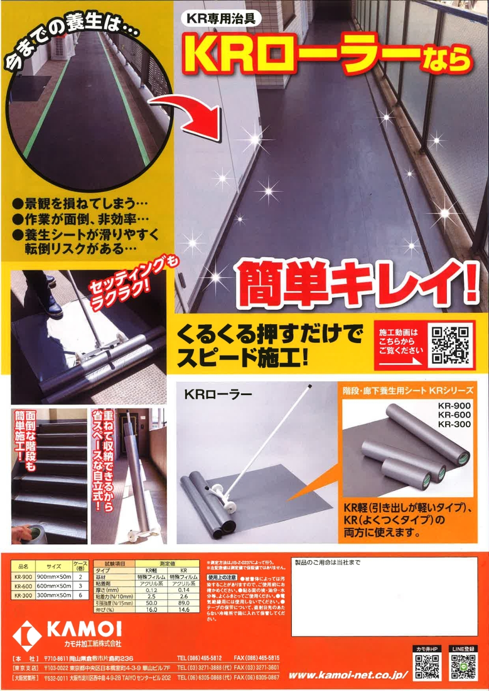 大規模改修の養生をもっと速く、もっとキレイに! KR専用治具「KRローラー」なら、くるくる押すだけで廊下や階段の養生をスピード施工。シートのズレやシワを抑え、一人作業でも効率アップ! 入り組んだ床面や面倒な階段もラクラク対応! 軽い引き出しタイプとよくつくタイプの2種に対応し、現場に合わせて選択可能! 作業時間短縮と安全性向上を同時に実現します y(o´∀`o)y!