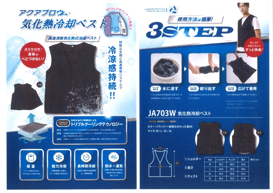 炎天下の現場でも、もう我慢はいらない! 水と風の力で身体を芯から冷やし、集中力と作業効率をキープ。軽量・簡単装着で、長時間の作業も快適に。熱中症リスクを下げ、仲間の安全も守る一着。現場のプロにこそ選んでほしい“次世代の涼しさ”です (*^^*)!
