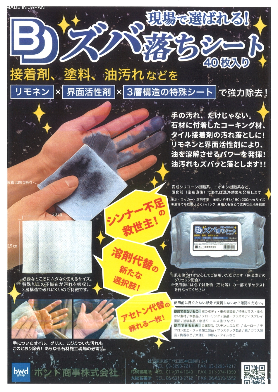 頑固な油汚れ・接着剤・塗料もこれ一枚でスッキリ除去! リモネンと界面活性剤の力で汚れをしっかり分解し、3層構造シートがしっかり絡め取ります! 手の汚れはもちろん、石材やタイルに付着したコーキング材にも対応! 水や溶剤いらずで手軽に使え、現場作業の効率アップに最適。プロも選ぶ頼れるクリーニングシートです (^^ゞ!