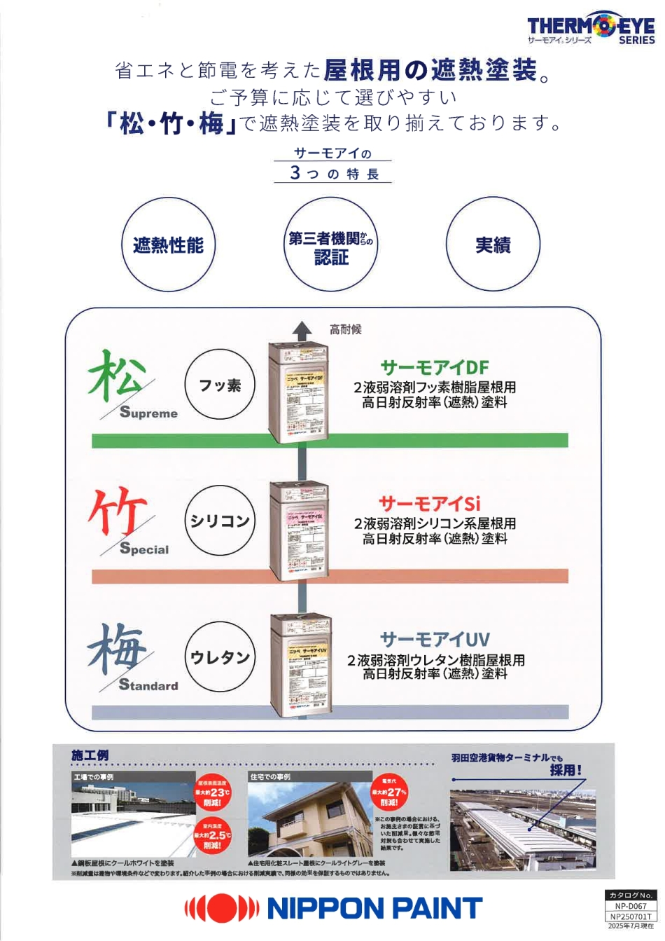 今年も暑かった夏、間違いなく来年も暑くなるであろう、夏。 熱を抑える遮熱塗料は、ニッペブランドでは、松竹梅の3段階ラインナップ! ご予算と期待耐用年数に応じて、同じ色でも塗料を選択可能です! ぜひ、来夏に向けて、ご検討ください… ヽ(〃^-^)/!